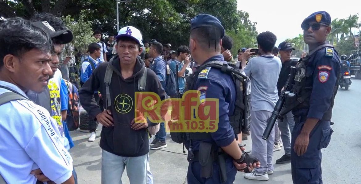 Kandidatu ajente PNTL sira halibur malu área Tasi-ibun Palásiu Governu nian hodi submete petisaun ba PM Xanana Gusmão no ezije atu komisaun rekrutamentu PNTL submete mós sira-nia lista iha teste médiku. Imajen/Rafa.tl