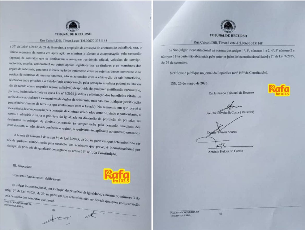 DÍLI, 26 de março de 2026 (RAFA.tl) – O Tribunal de Recurso considera que não são inconstitucionais as normas que determinaram a revogação retroativa das pensões vitalícias em Timor-Leste, medida polémica aprovada pelo Parlamento Nacional na sequência de protestos de jovens em setembro do ano passado.